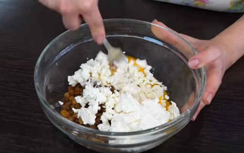- Складіть в миску сир, цукор, розпушувач. Вбийте яйце, викладіть сир. Попрацюйте міксером, збивши вміст до однорідності.