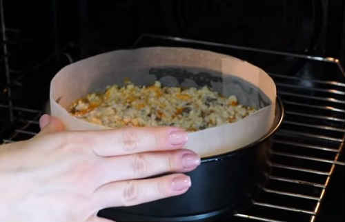- Всю масу добре перемішайте. Викладіть в промаслений форму. Поставте запікатися на годину, розігрів духової шафи до 200 про С.