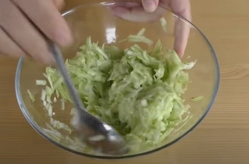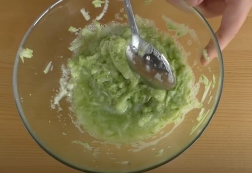 Один кабачок середнього розміру потріть на тертці великої стружкою. Підсолити (досить половинки чайної ложечки), залиште постояти хвилин 15, щоб овоч пустив сік.