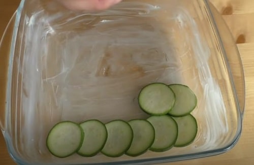 Промажьте жароміцних форму шматочком масла. Покладіть нижній шар з половини овочевих кружечків.