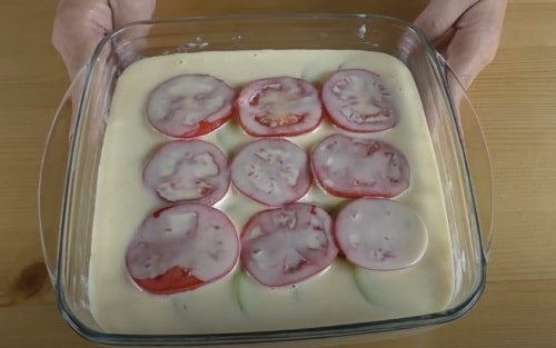 Зверху розмістіть помідори, нарізані також, кружками. Розміщуйте, як вийде, тут порядок укладання не є принциповим.