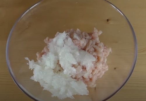 Дуже дрібно покришите цибулину, а ще краще натріть на тертці. Додайте його в курячий фарш. Туди ж відправте роздавлений пресом часник.
