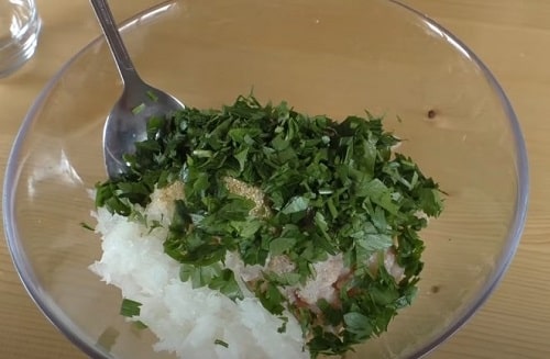 Порубати петрушку, відправте в миску. Поперчіть фарш і добре перемішайте.