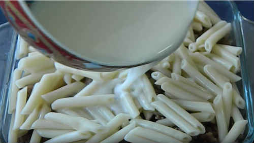 Слідом укладіть макаронний шар. Пролийте молочною сумішшю.