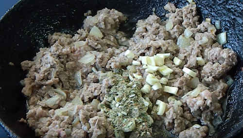 У обсмажене м’ясо додати часникову крихту, спеції (набір можна додати свої, за бажанням), посоліть. Трохи посмажте (буквально пару хвилин) і зніміть з вогню.