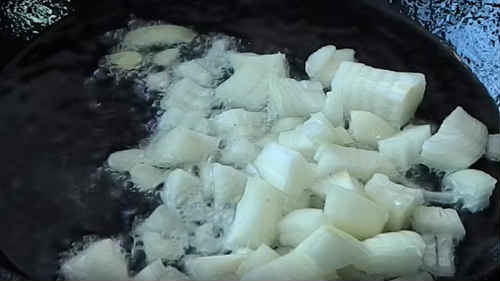 Паралельно покришіть цибулину. Відправте на сковорідку, посмажте в олії до легкої рум’яності.