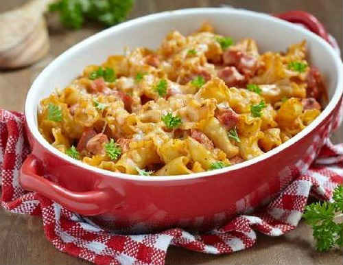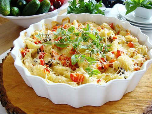 Як приготувати запіканку з макаронів з сиром, ковбасою і помідорами