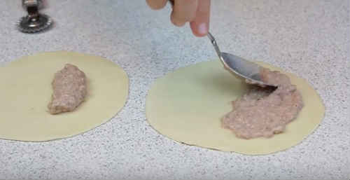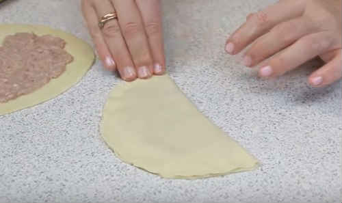 - Викладіть в центр кожної заготовки фарш, зліпіть чебурек.