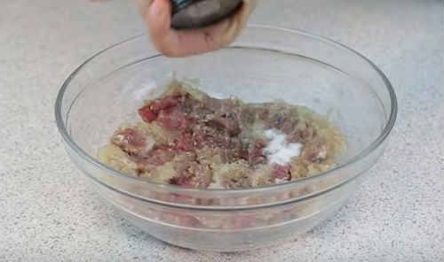Проверніть м’ясо, перетворивши у фарш, підсолити його, поперчіть, перемішайте.