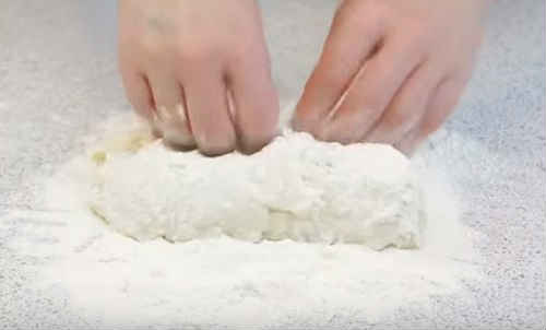 Спочатку вміст легко перемішується ложкою. Коли це стане важко, перенесіть масу на припудрений борошном стіл. Працюйте руками, сформувавши щільний тестовий ком. Ідеальне тісто буде еластичним, абсолютно не буде липнути до рук і столу.