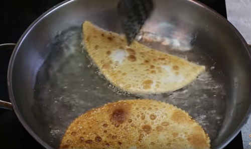 - Посмажте чебуреки у великій кількості розпеченого масла. Коли з’явиться чарівна хрустка скоринка – дістаньте і викладіть на паперову серветку, щоб скло зайве масло.