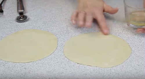 - Потім розкачайте в коржик, наріжте великі заготовки для чебуреків. Викладіть начинку, скріпіть краю коржів.