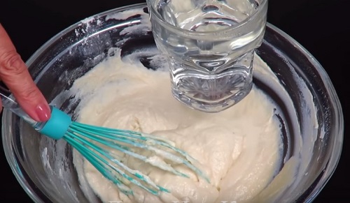- Не припиняючи швидко розмішувати масу, тонкою цівкою залийте вскипяченную воду.