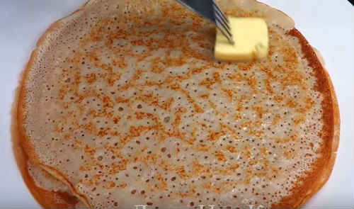 - Спечіть млинці на розпеченій сковороді з обох сторін, покладіть на плоску тарілку, змастіть маслом. Промащувати сковороду олією потрібно тільки в перший раз, потім такої необхідності немає.