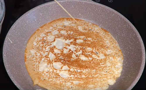 - Налийте трохи тіста, поверніть сковороду по колу, розподілити тісто по поверхні. Посмажте коржик з обох сторін до красивої рум’яності.