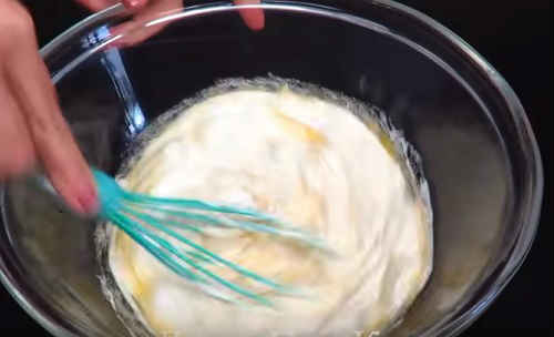 - Залийте кефір в ємність, додайте цукор, сіль, розколотіть віночком.