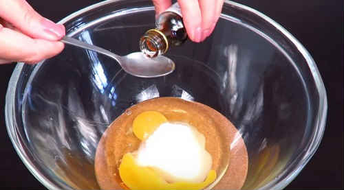 Розбийте в миску яйця, посипте сіль з цукром, влийте ванільний екстракт. Розмішайте віночком.