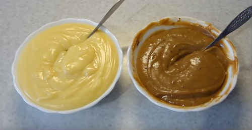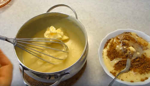 Дуже простий рецепт запропонувала бабуся Емма, відомий відео-блогер. Готовий крем використовується для покриття тістечок, тортів, биксвита, та інших десертів. Можна пропонувати як частування, прикрасивши його фруктами і посипанням з шоколаду.