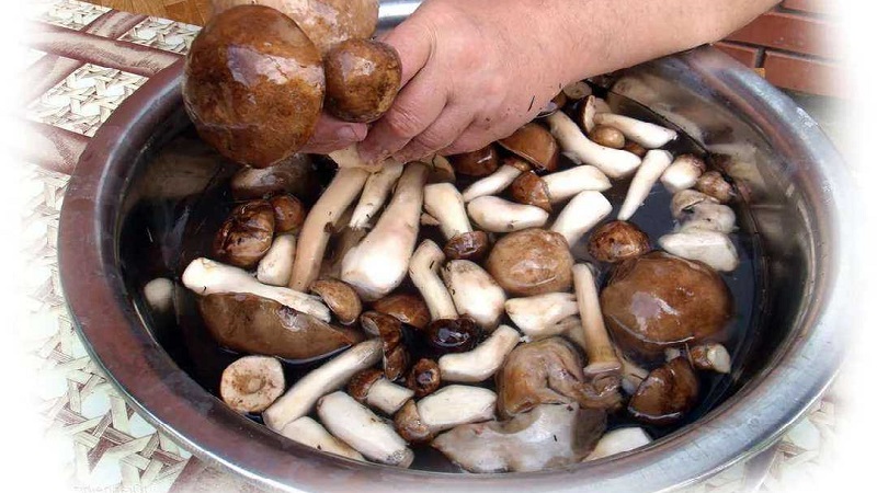 - Промивають проточною водою. Щоб позбутися від комах і черв’яків, готують сольовий розчин. У ємність наливають холодну воду, насипають сіль (100-200 г на 5 л). Замочують на час від 20 хвилин до 12 годин. Пластинчасті гриби (вовнянки, лисички, грузді та ін) замочують на 6-12 годин, трубчасті (підосичники, маслюки, підберезники та ін) — на 20-30 хвилин. Гриби з гіркуватим присмаком (чорні грузді) вимочують до трьох діб, періодично міняючи воду.