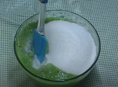 Додайте відповідне кількість желирующей солодощі. Гарненько розмішайте. Засипте цукор невеликими порціями, щоб зручніше було вимішувати.