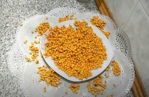 Зніміть ягідки з гілок, переберіть, відсортуйте зіпсовані. М'яті і переспілі використовувати в заготівлі можна. Гарненько помийте, підсушувати плоди не обов'язково. Зважте обліпиху, щоб знати, скільки брати солодощі.