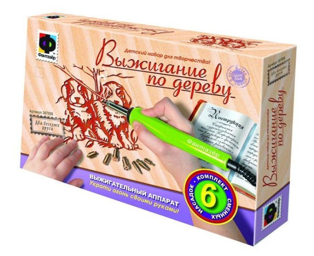 Один з найпопулярніших подарунків на Новий рік хлопчику 10 років – це набір для випалювання. В комплектах є сам прилад, кілька різних насадок і приклади картинок.