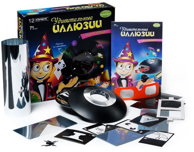 Набір для дослідів «Оптичні ілюзії». Така гра допоможе створювати і вивчати оптичні ілюзії в домашніх умовах. Причому абсолютно безпечно. Для цього в комплекті є все необхідне: сфетофильтры, заготівлі, інструкції.