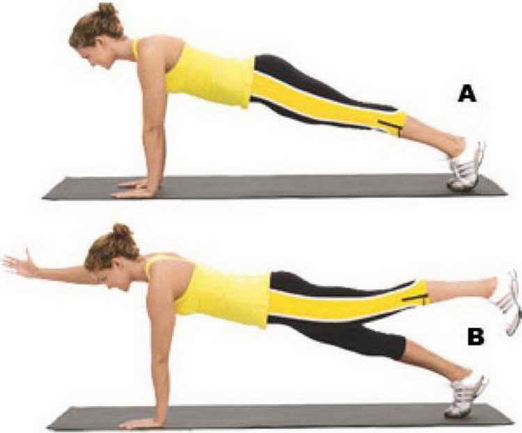 Займіть положення «планки», упершись шкарпетками і руками в підлогу. Ноги і руки при цьому повинні бути на ширині плечей. Вдихаючи, підніміть праву руку і ліву ногу, щоб утворилася рівна лінія. Видихаючи, прийміть вихідне положення, а потім піднімайте іншу руку і ногу. Повторити його необхідно 20 разів на кожну сторону.