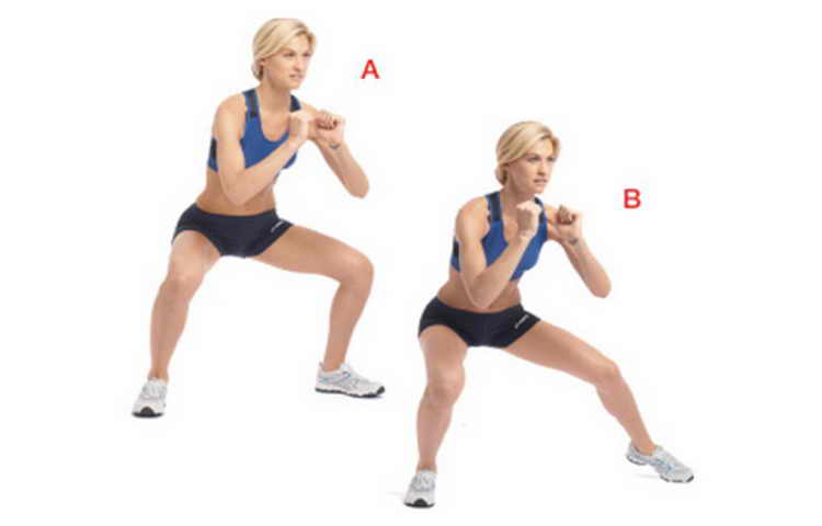 Ноги поставте поруч і трохи присядьте, спина повинна бути рівною, а руки напівзігнутими. Зробіть невеликий крок правою ногою праворуч, а потім, не зупиняючись, зробіть ще 2 дрібних, поки не опинитеся з широко розставленими ногами. Потім підтягніть ліву ногу і продовжуйте робити вправу в іншу сторону. Повторити такі присідання з кроками слід 10 разів в кожну сторону по 2 підходи.