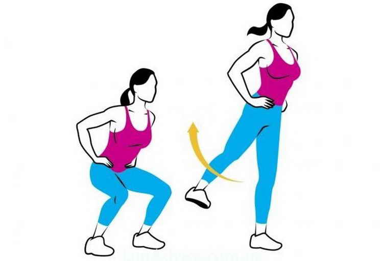 Поставте ноги на ширині плечей, руки на пояс і зробіть полуприсед з рівною спиною, потім підніміться вгору і зробіть мах правою ногою убік, повторіть вправу для лівої ноги. Рекомендується зробити за 20 махів на кожну ногу, а після повторити ще один підхід.