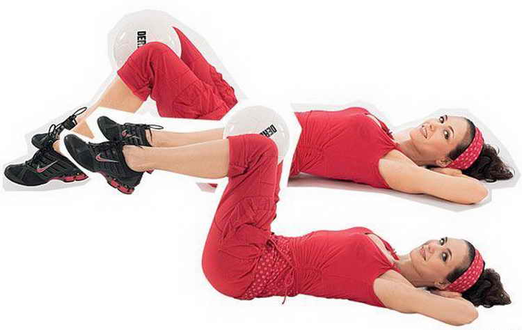 Ляжте на підлогу, притисніть поперек, зігніть ноги в колінах і тримайте їх під кутом 90 градусів, потім між колінами помістіть м’яч (футбольний або звичайний м’який). Руки заведіть за голову і не поспішаючи опускайте і піднімайте ноги, так ви будете качати сідниці і внутрішню поверхню стегна. Потім ноги можна вирівняти м’яч ступнями затиснути, руки покласти уздовж тулуба і продовжити піднімати рівні ноги, таким чином, ви пропрацюєте прес.