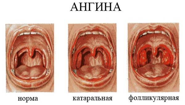 Для ангіни характерно гострий початок: починається озноб, запалюється і болить горло, болить голова, підвищується температура (до 39,5 градусів). Лімфовузли на шиї збільшуються і легко прощупуються.