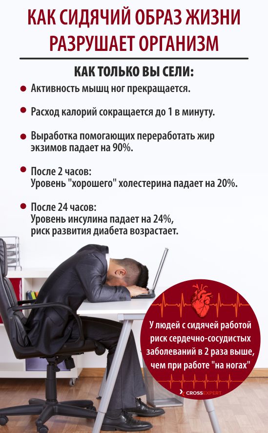Геморой і варикоз, які є природним продовженням постійного сидіння – не єдині неприємності. Інсульти та інфаркти помолодшали з-за холестеринових відкладень, зміни природної циркуляції і погіршення стану судинних стінок.