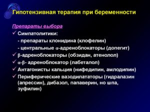 Він знижує загальний і внутрішньочерепний тиск. Такі жінки в майбутньому можуть спокійно народжувати. Було не одне дослідження, яке підтвердило відсутність тератогенної дії ліків. В схему лікування включають мінеральні добавки (магнію сульфат). Якщо гіпертонія у вагітних на тлі прееклампсії не усувається, то потрібно розродження.