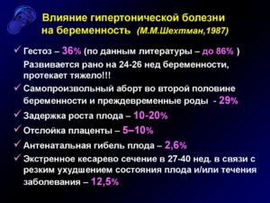 Перебіг вагітності при гіпертонії буває важким і небезпечним. Лікар може підняти питання про госпіталізацію хворий. При підвищеному артеріальному тиску при вагітності перше планове обстеження можливо на терміні до 12 тижнів. У цей період лікар визначає, чи можна далі виношування малюка.
