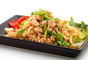 Процес приготування: покришити курку на невеликі шматочки, смажити на сковороді, попередньо змащену маслом. Тим часом поставити варити рис, перед цим добре промивши його водою.