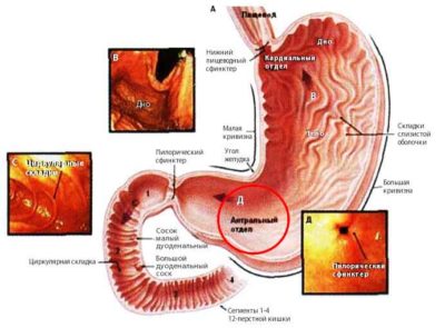 Площа антрального відділу дорівнює 1/3 всього шлунка. Локалізується цей відділ в нижній частині органу.