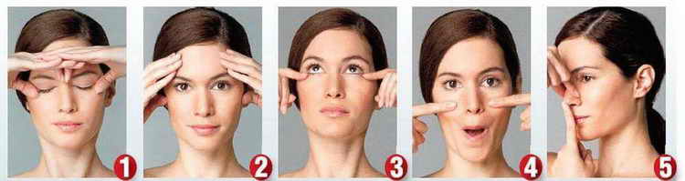 Дуже ефективним може виявитися просте вправу проти «гусячих лапок» навколо очей: поставте вказівний і середній пальці на верхню частину скули якраз посередині, натисніть на точку. Плавно рухайтеся до слізного каналу, натисніть і утримуйте натискання кілька секунд. Перемістіть пальці до середини брови, відчутно натисніть на цю точку. Поступово прискорюйте руху, повторюючи по колу 10 разів.