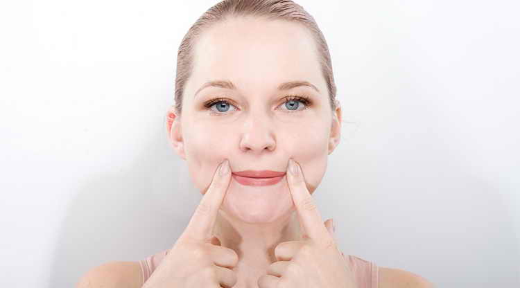 - Стисніть губи так, щоб зуби не стискався, розімкніть щелепи. Вказівними пальцями піднімайте вгору куточки губ, опираючись губами. Коли напруга буде максимальною, зупиніться на 10 секунд. Повторюйте десять разів.