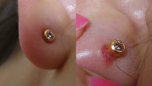 Також кровотеча з ранки може бути наслідком алергії на метал або реакцією на вдевание сережок з великим діаметром гачка, ніж сам прокол. Єдиним вирішенням даної проблеми нерідко буває тільки зняття прикрас.