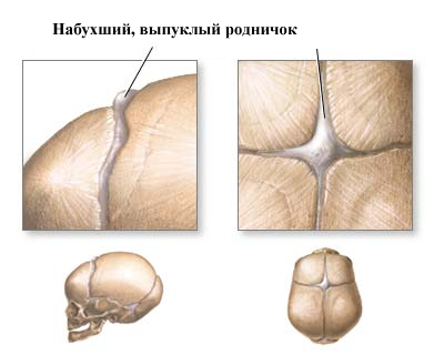 - опуклому пульсуючому родничку на голові;