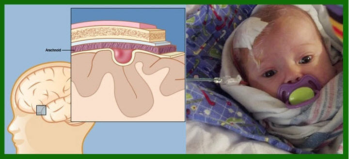 В павутинній мозковій оболонці з-за механічних пошкоджень, внутрішньочерепних кровотеч, інфікування у новонародженого може виникнути арахноідальной кіста головного мозку, схильна до збільшення, якій також більш схильні хлопчики.