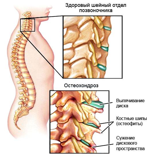 Остеохондроз шийного відділу хребта, крім іншої різноманітної симптоматики, проявляється тремором голови. При розвитку захворювання хребта, в основі якого лежить дегенерація кісткової і хрящової тканини, змінюється положення шийних хребців, затискаються нервові закінчення і погіршується кровопостачання голови. Починається кисневе голодування мозку.