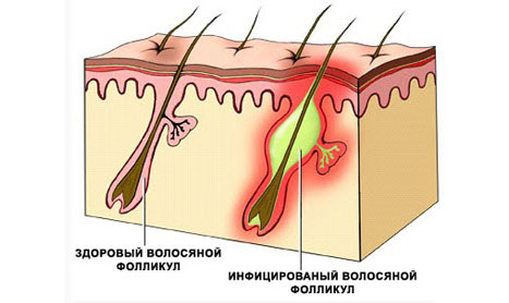 При попаданні бактерій волосяний фолікул запалюється. На шкірі з’являються червоні плями, що перетворюються в невеликі гнійники зеленуватого кольору. Вони згодом лопаються, підсихають. У важких випадках з’являються фурункули.