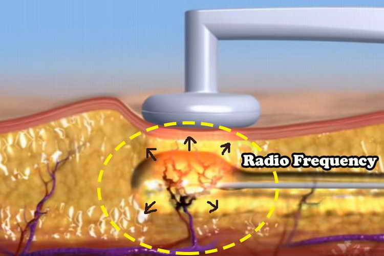 Даний метод корекції вважається самим новим і безпечним. Радіочастотна ліпосакція підборіддя припускає руйнування жирового депо за допомогою електродів. Один з них залишається на поверхні шкіри, а інший вводиться в жирову тканину. Потім між цими електродами виникає радіочастотне поле, під впливом якого руйнується і розщеплюється жир.
