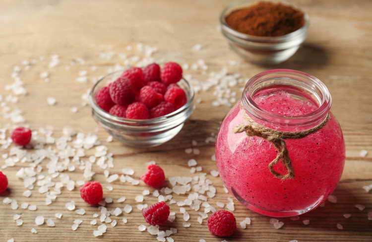 - Ягідний скраб. Домашні засоби, що містять полуницю або малину, добре омолоджують епідерміс і освітлюють його. Для приготування скрабу беруть 30 грам ягід, які ретельно розмелюють, щоб вийшло пюре. В утворену кашку додають 10 мл вершків, якщо шкіра суха. Для жирної шкіри до ягід додають 15 г меду, а нормального типу підійде комбінація з ягідного пюре і 10 мл гелю для вмивання.
