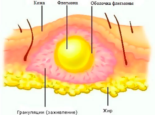 Флегмона являє собою запалення підшкірної клітковини, що розвивається під впливом патогенних мікроорганізмів, найчастіше стафілокока. Почавшись у вигляді маленького вогнища, флегмона може вирости до величезних розмірів і знищити організм, якщо освіта не вирізати і не почати терапію антибіотиками. Виникає флегмона поле переохолодження з тієї ж причини, що і застуда, — зниження імунітету.
