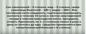 Лікування підвищеного нижнього тиску можливо з використанням методів народної медицини, які володіють високою ефективністю і на відміну від медикаментів не завдають шкоди організму (при правильному застосуванні). Їх використання можливе у вигляді настоянок, настоїв, соків і трав’яних зборів: