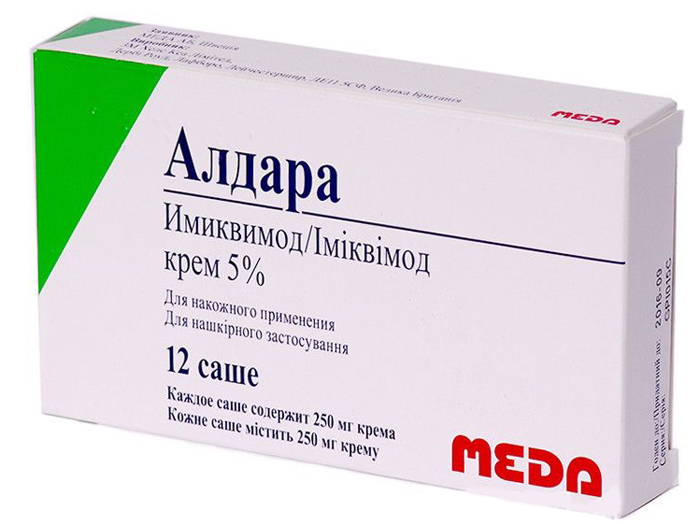- Алдара. Мазь хороша тим, що не має протипоказань, однак, не допускається до використання в ранньому дитячому віці. Засіб використовується без накладення пов’язки і повторно наноситься кожні 6-10 годин.