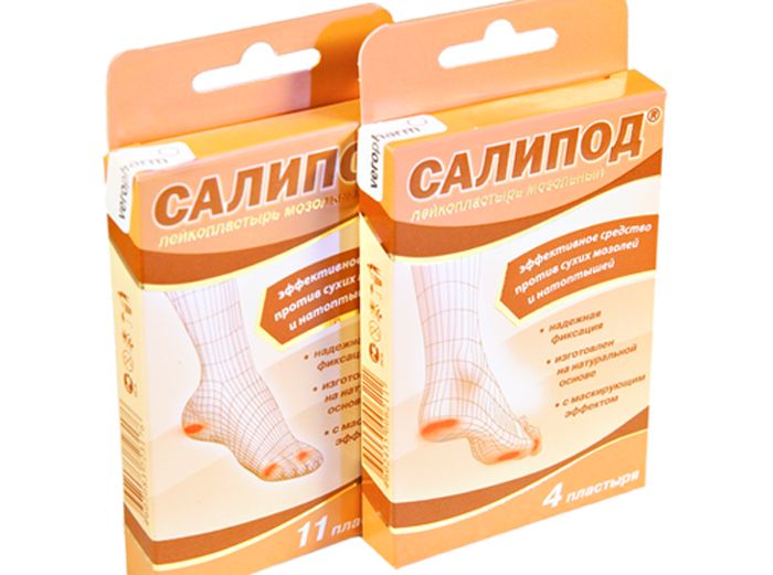 - Салипод. Препарат, виготовлений у формі пластиру з нанесенням саліцилової кислоти. Для використання наріст попередньо розпарюють, а після наносять пластир. Процедуру повторюють кожні кілька днів до досягнення необхідного результату.